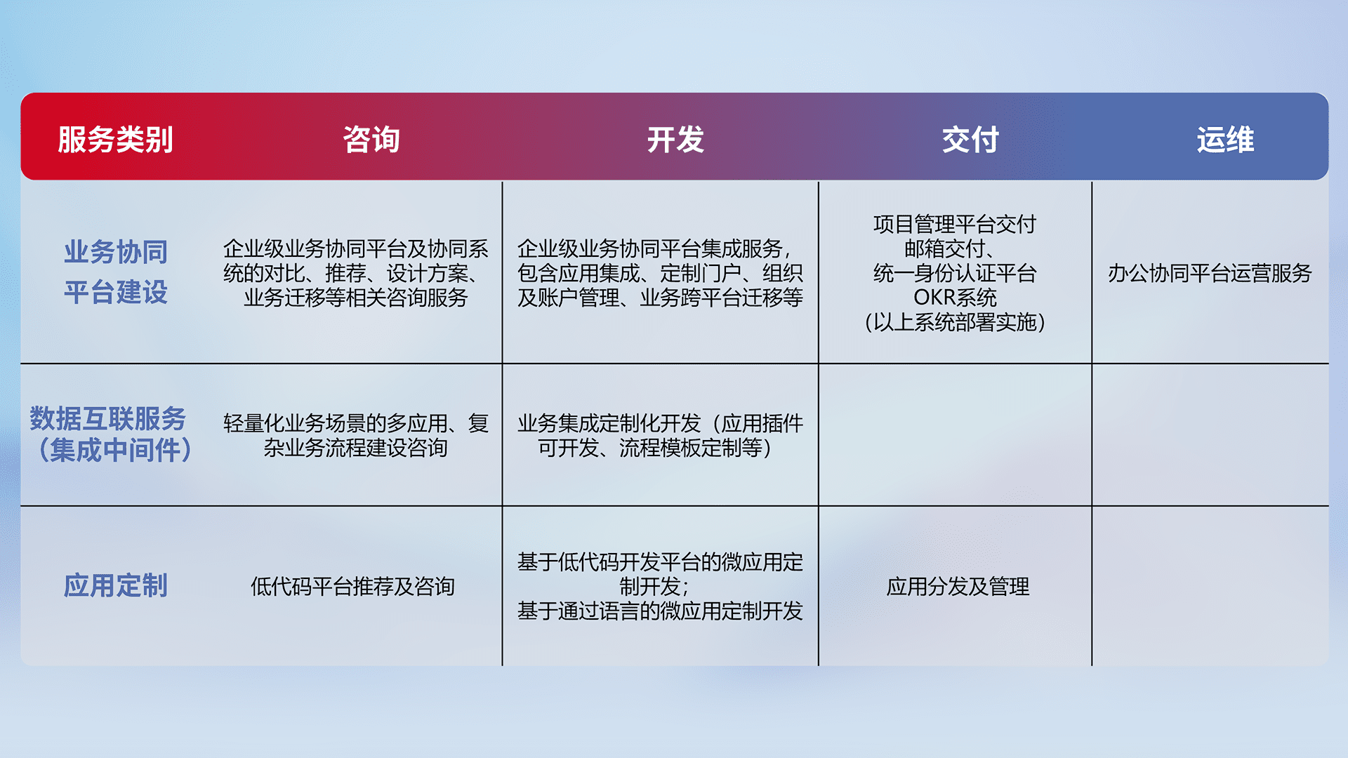 针对钉钉、、、、企微、、IDaas等平台级产品提供产品的规划、、、、方案、、交付、、、定制化开发等服务,,,实现如统一协同办公、、、、智能客户服务、、、混合会议管理、、智能数据查询、、、等业务场景,,,实现数字化转型。。。。